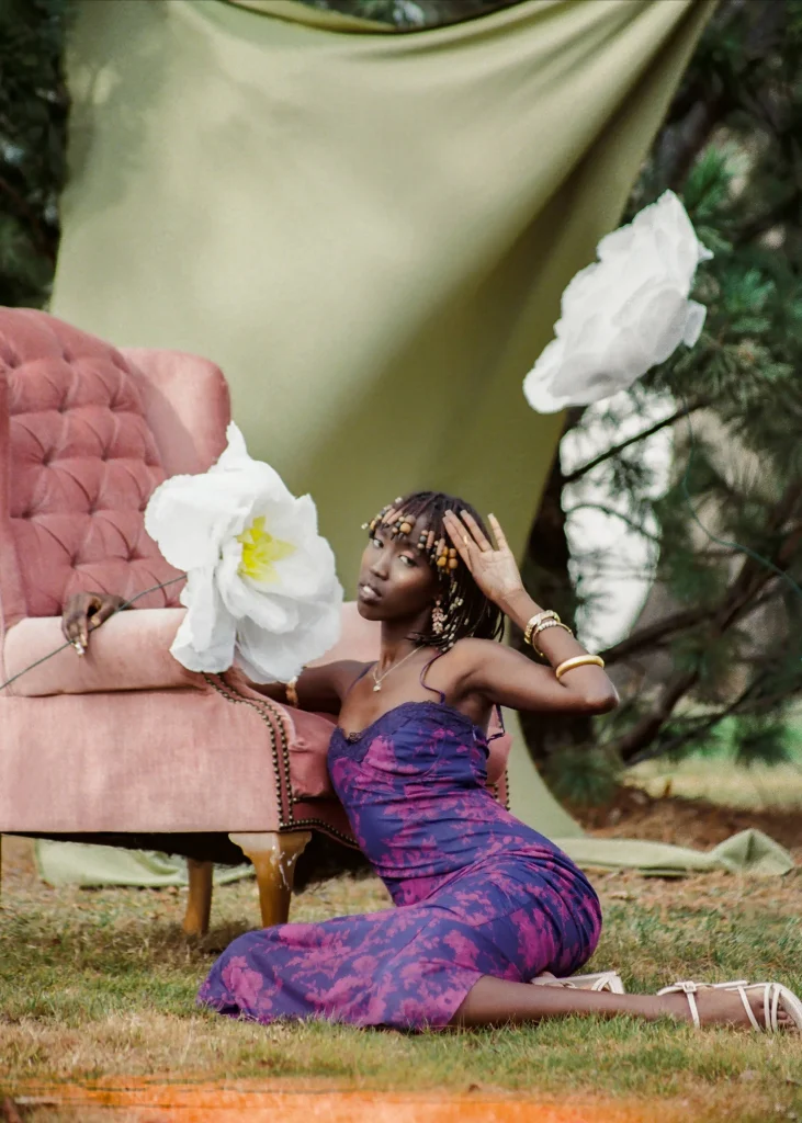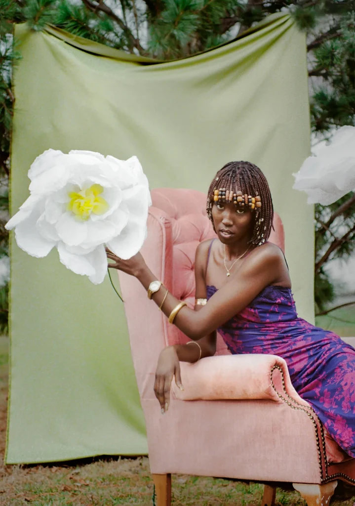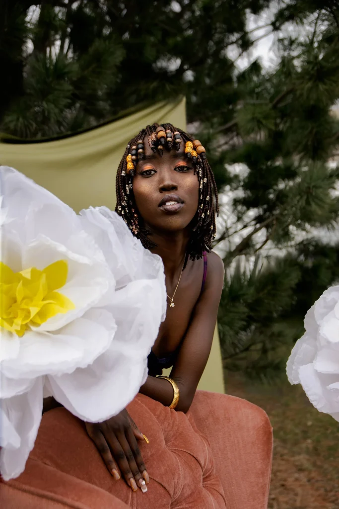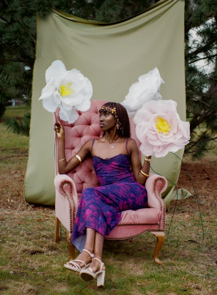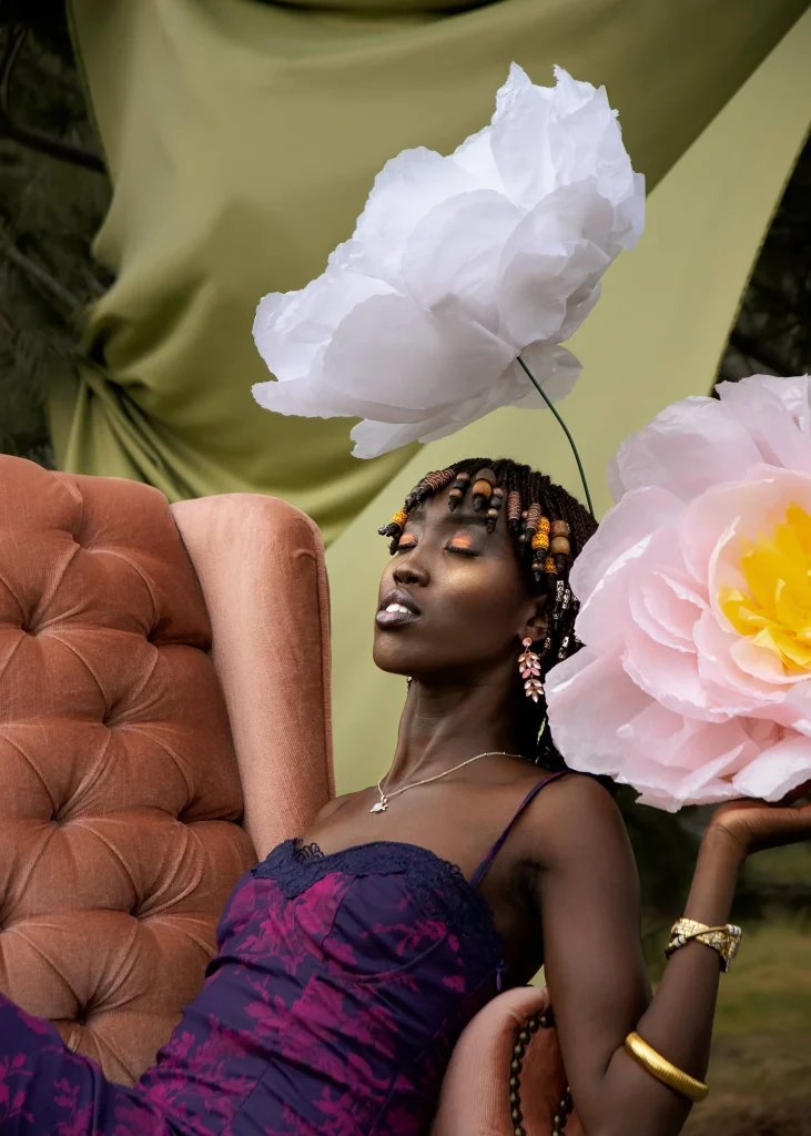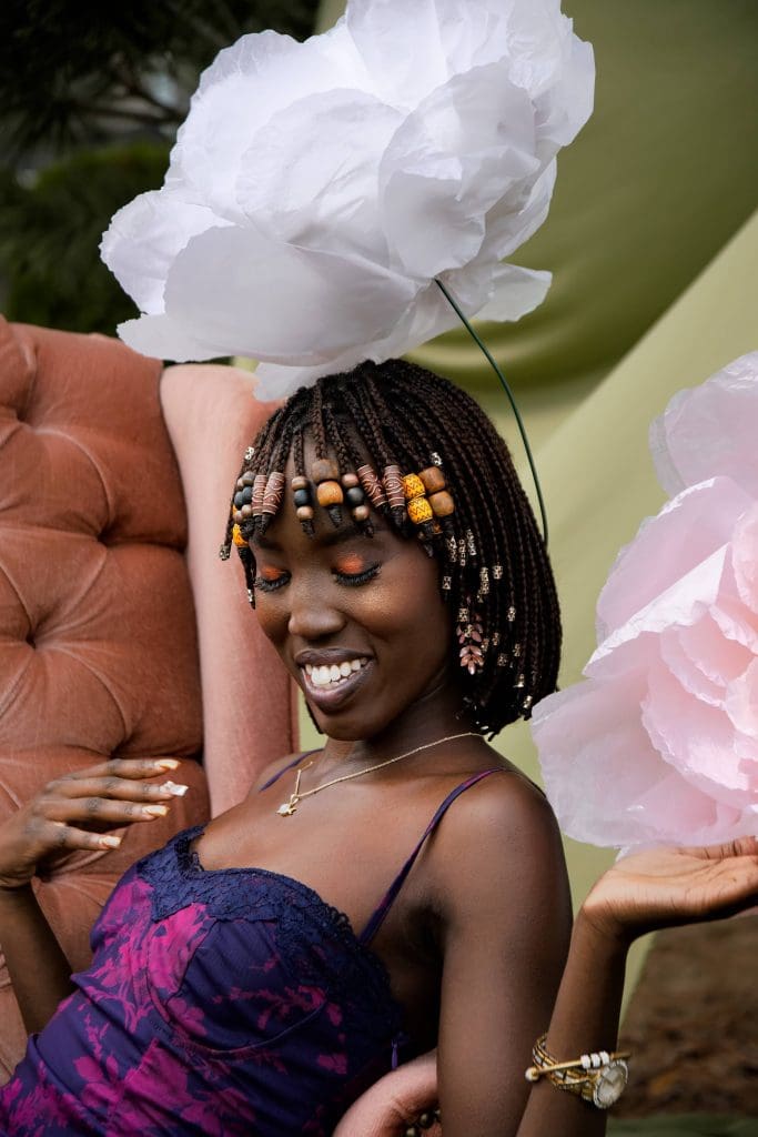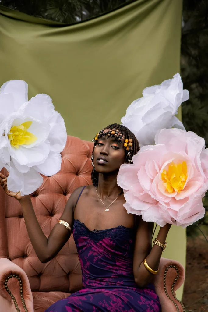 Nyamal Loll is captured alongside paper flowers to represent the community building work she does. Nyamal sets an example for the kind of community she’d like to see and is actively building. The paper flowers represent a visual example that others can follow and be inspired by to grow their own flowers, eventually allowing for an entire garden, or community, to grow.